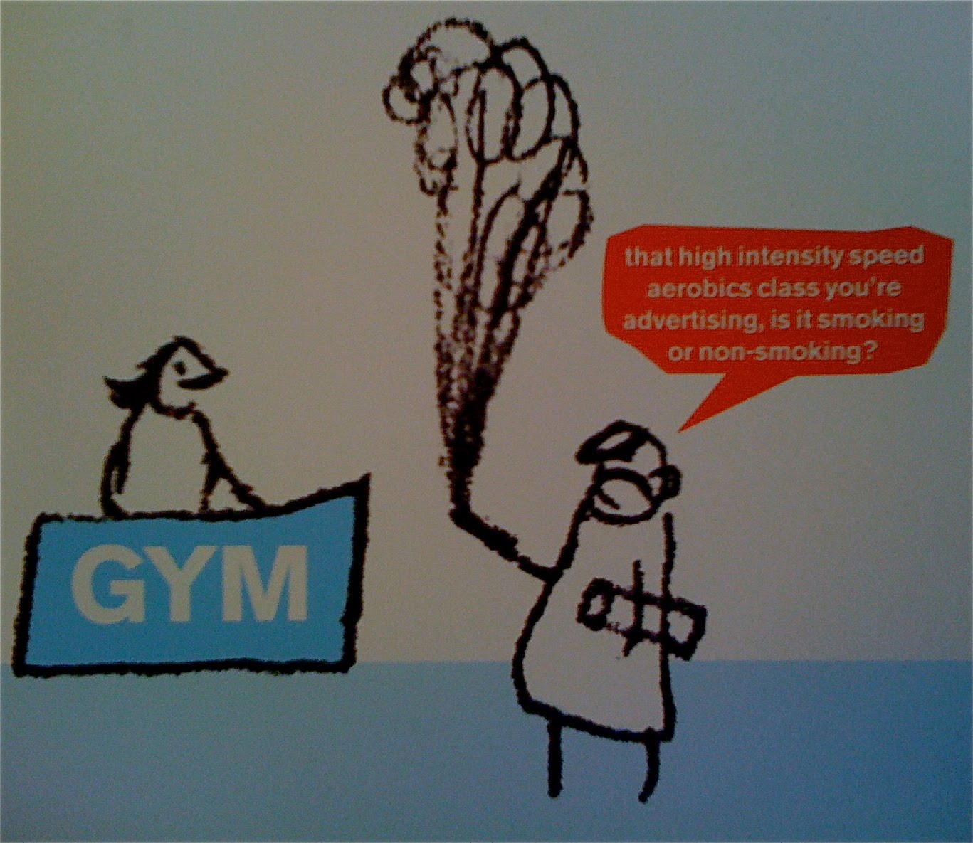 This picture is actually a card that somebody once gave me. Somebody that obviously knows me very well. For those of you who don’t, I’ll say this: I speed-walk, I swim, I work out, I dance, and on most days, all of the above. As of this Sunday, I will also be a certified instructor in ZumbaFitness, which, to borrow the card’s words, might simply be called “high intensity speed aerobics.” But to use the rest of the card’s words, I should add that I am also a certified, and champion, (chain) smoker. So make what you wish of my virtue, but please allow me my vice.